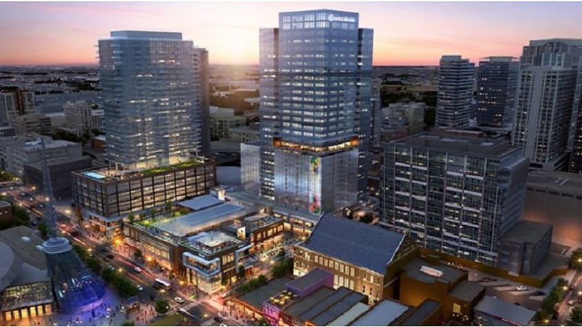 As part of downtown Nashville’s first mixed-use destination, tenants and residences will have direct access to the shopping and dining, connectivity to an elevated Nashville food market as well as a rooftop amenity terrace that features dramatic views.Construction began in 2017 and is slated for completion in March 2020.